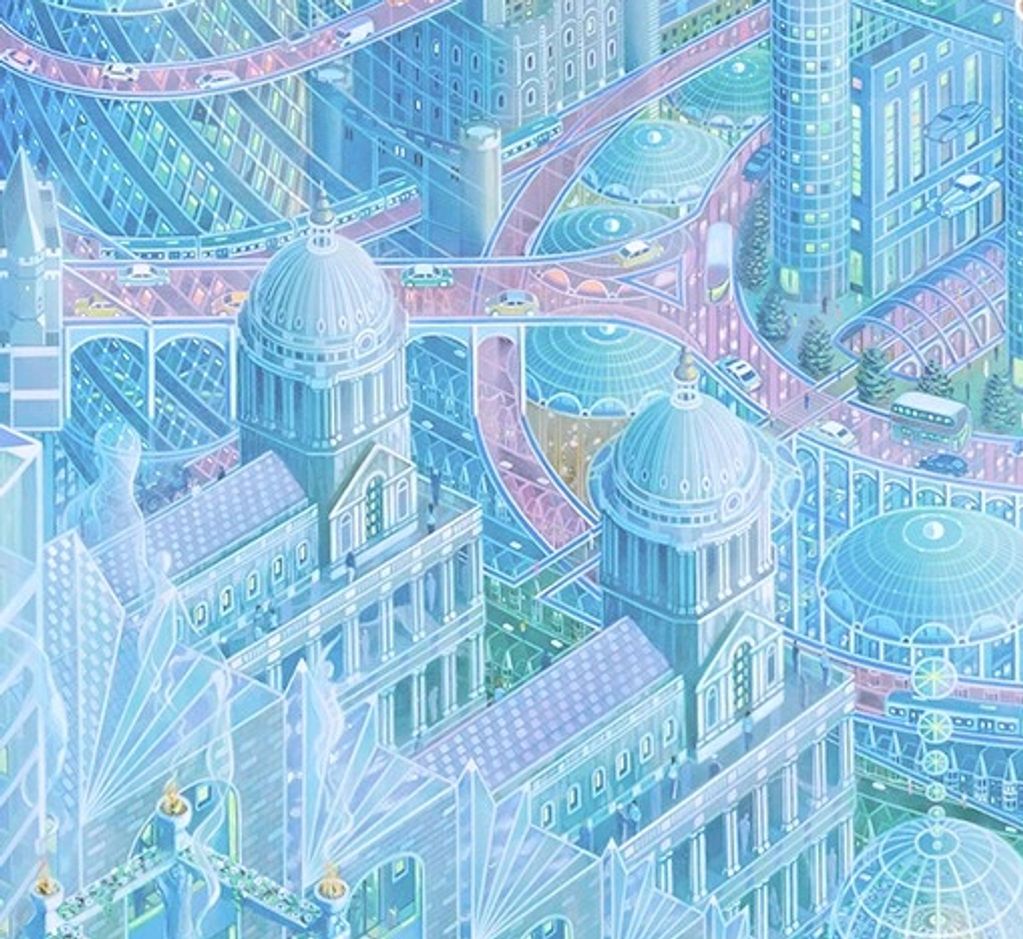 Detail Right - Past Greenwich, across to Canary Wharf, the Tower of London and familiar City outlines, conducted by a procession of millennial domes.